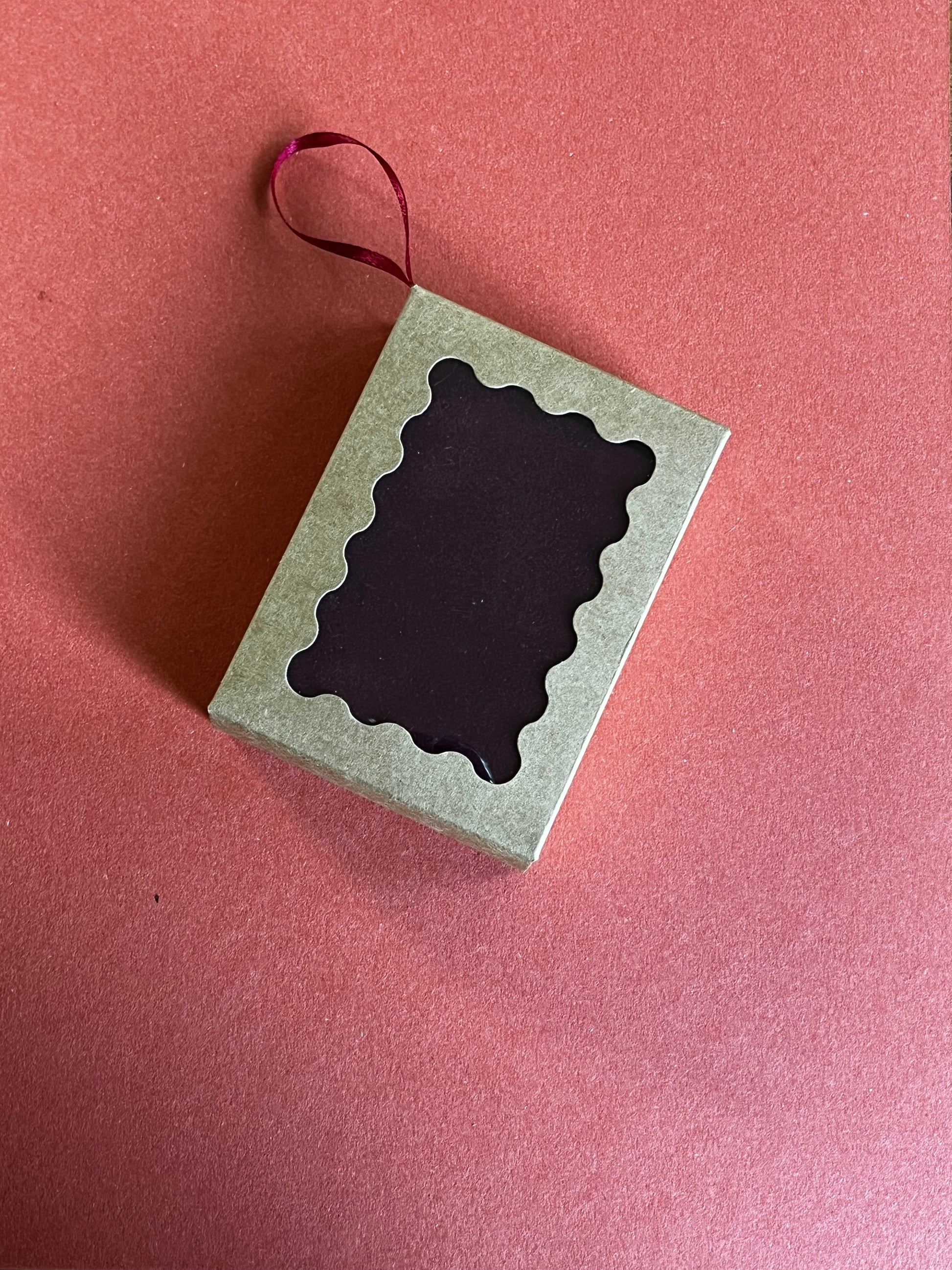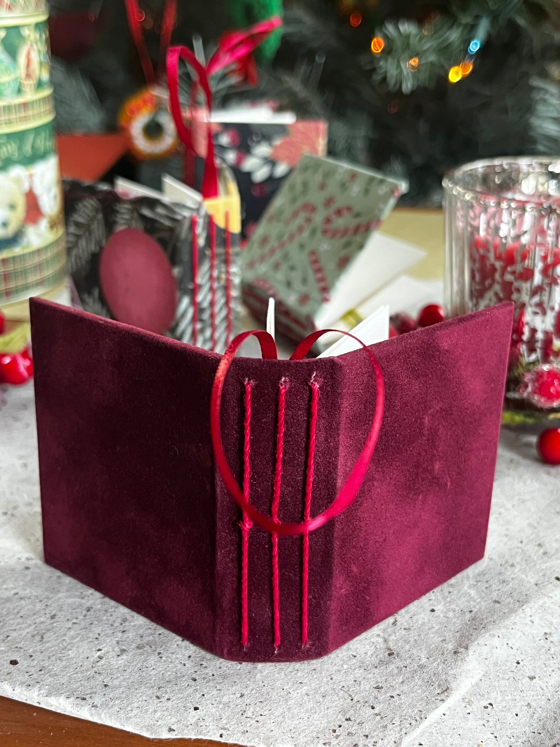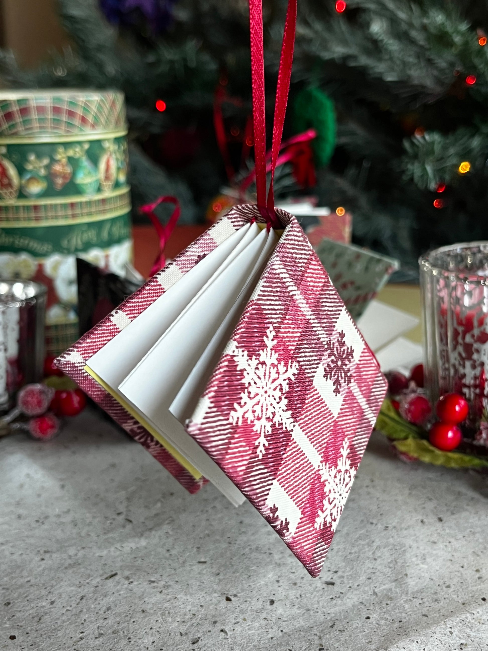 A real book with great watercolor paper - but tiny! These ornaments come in different book cloth patterns with pretty handmade end papers on the inside.